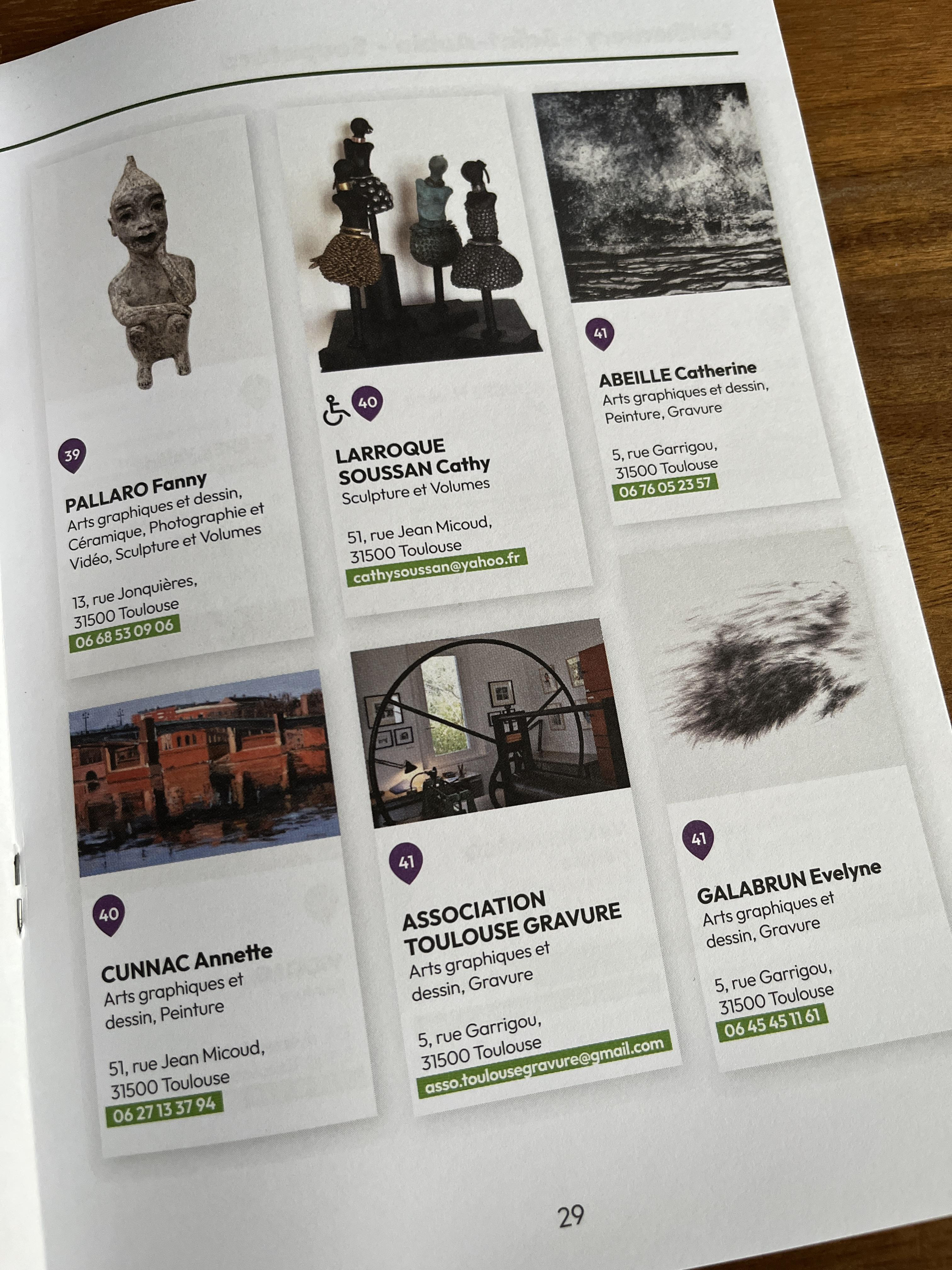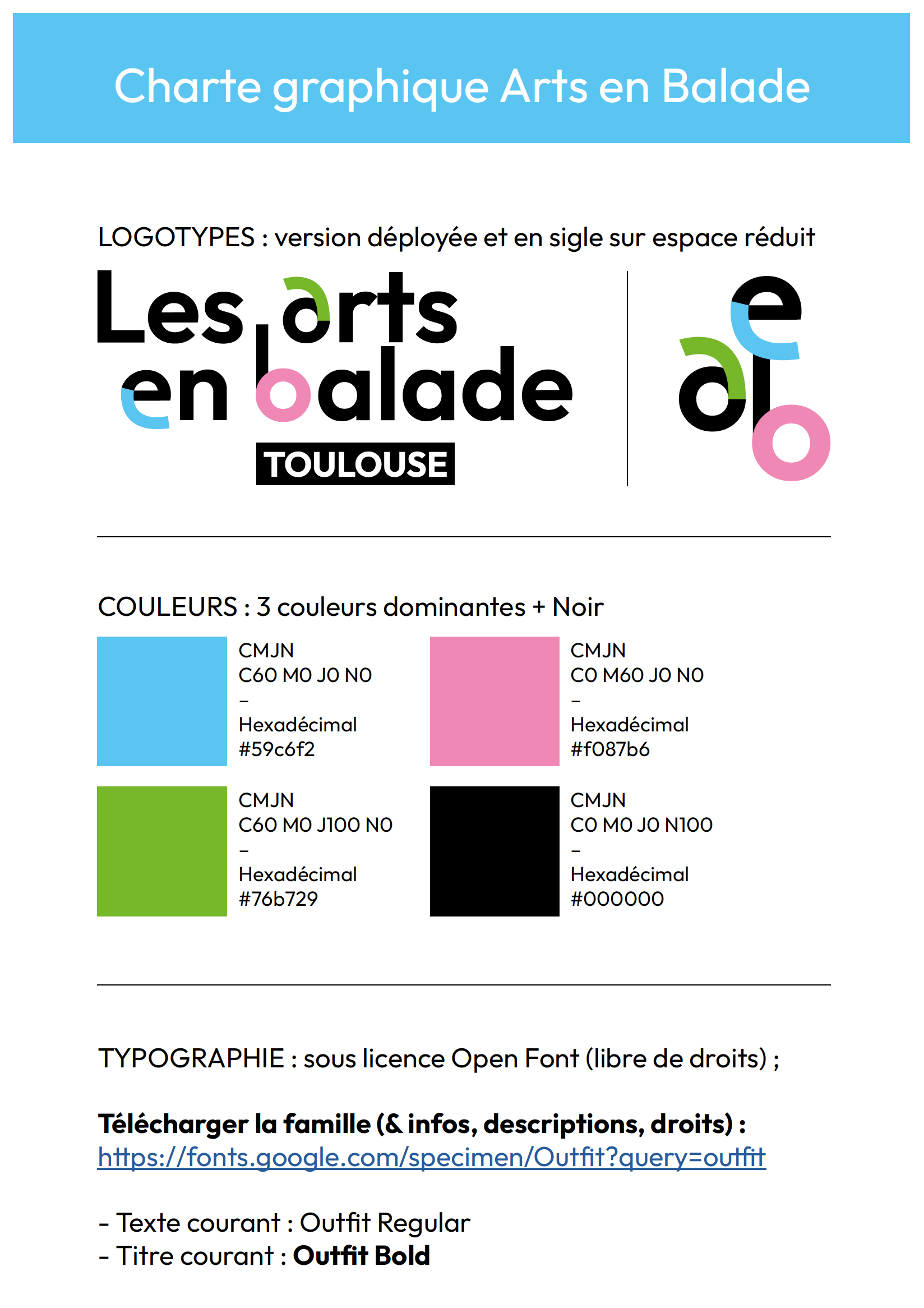 Identité visuelle des Arts en Balade à Toulouse : logotype, affichage public, livret, site internet… Un plan de communication a été développée également avec les étudiants du lycée les Arènes à Toulouse.