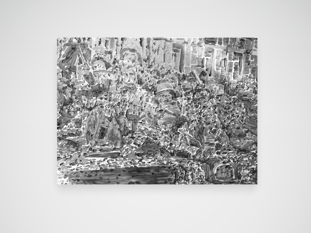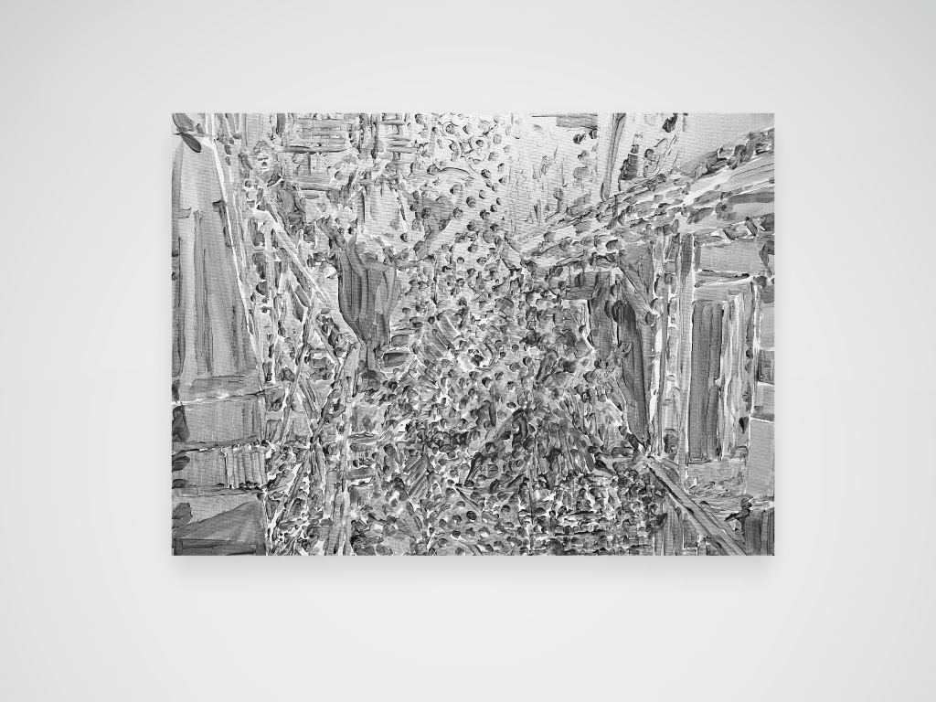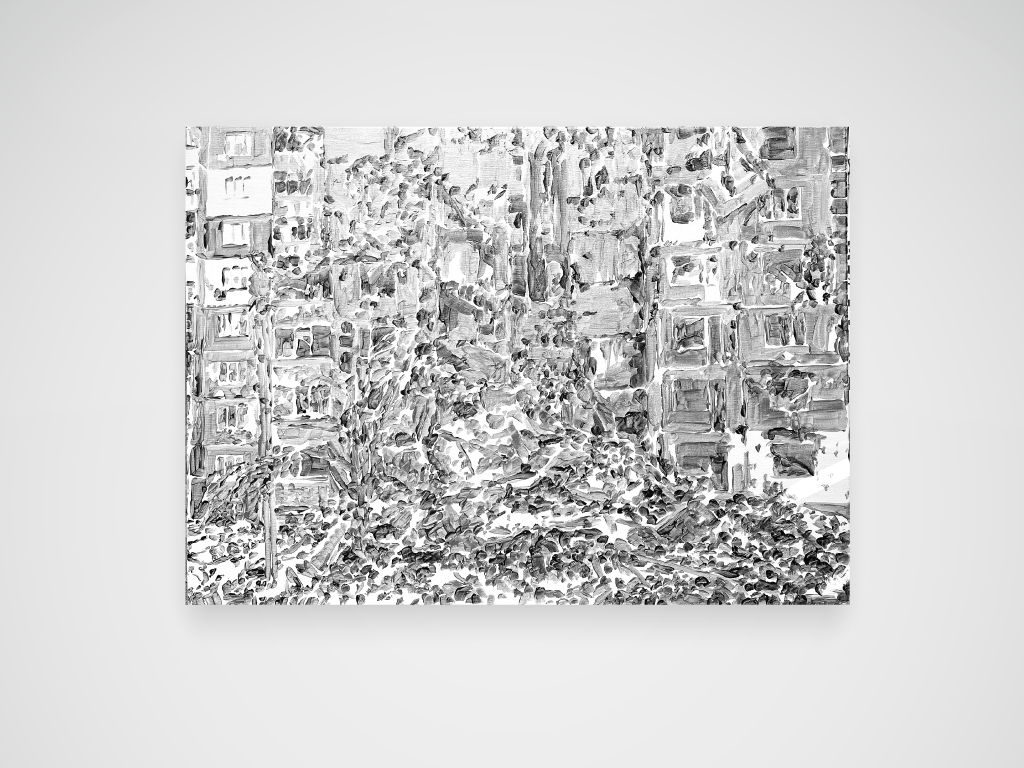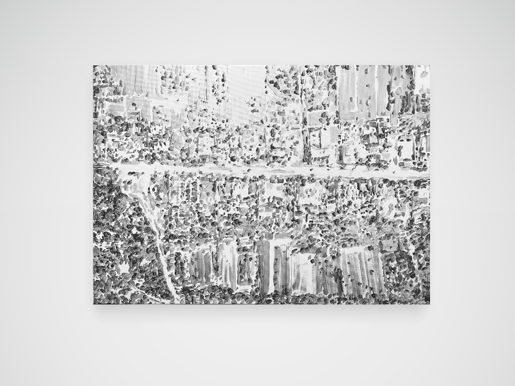 Tonalités argentées et argent trop cher pour une guerre en Ukraine. Acrylique sur toile. 73 x 100 cm.